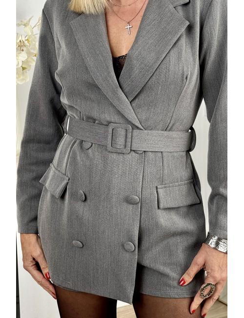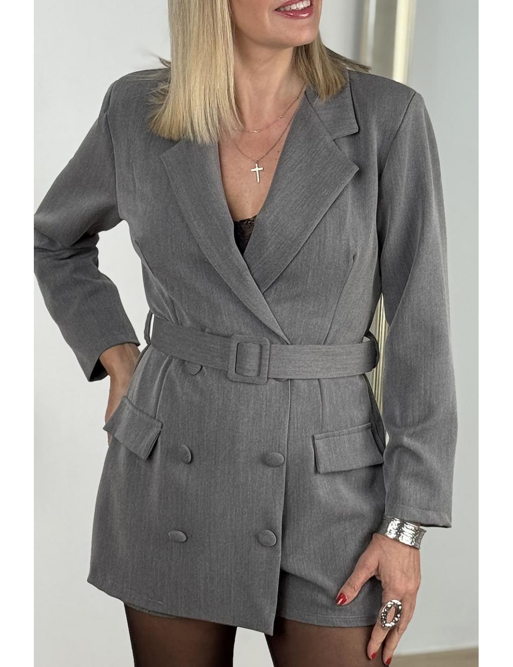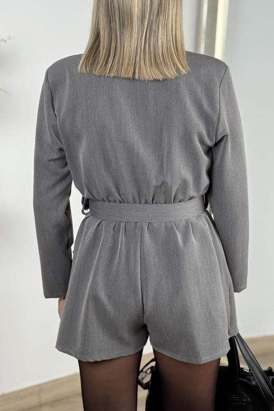 Mono corto elástico tipo blazer de corte sastre. Detalle de 6 botones y dos falsos bolsillos con solapas. Goma detrás en la cintura, cierre cruzado y cinturón téxtil con hebilla del mismo tejido.