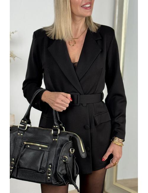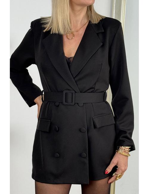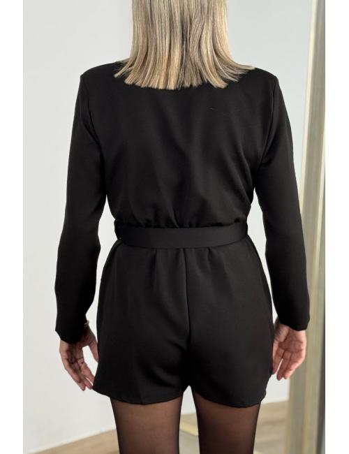 Mono corto elástico tipo blazer de corte sastre. Detalle de 6 botones y dos falsos bolsillos con solapas. Goma detrás en la cintura, cierre cruzado y cinturón téxtil con hebilla del mismo tejido.