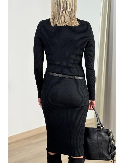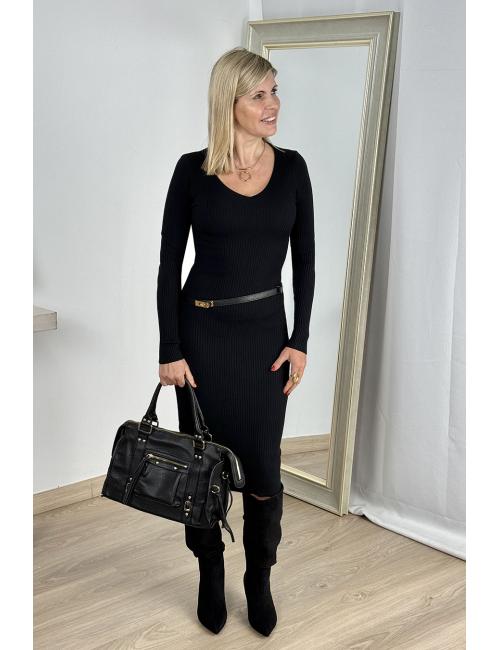 Vestido midi de manga larga confeccionado en punto canalé elástico y acabado cuello en pico.