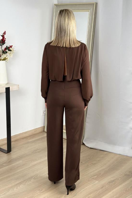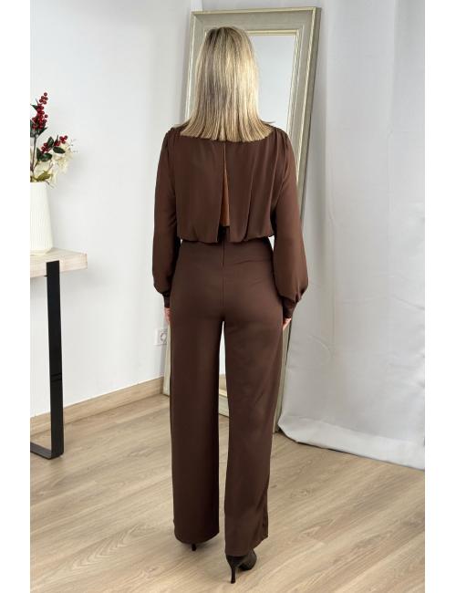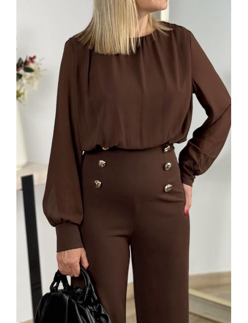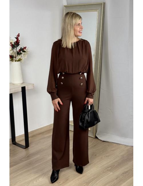 Mono largo fluído confeccionado con crepón y gasa en las mangas. Detalle de 6 botones dorados debajo de la cintura. Abertura vertical en espalda con cierre mediante un botón.