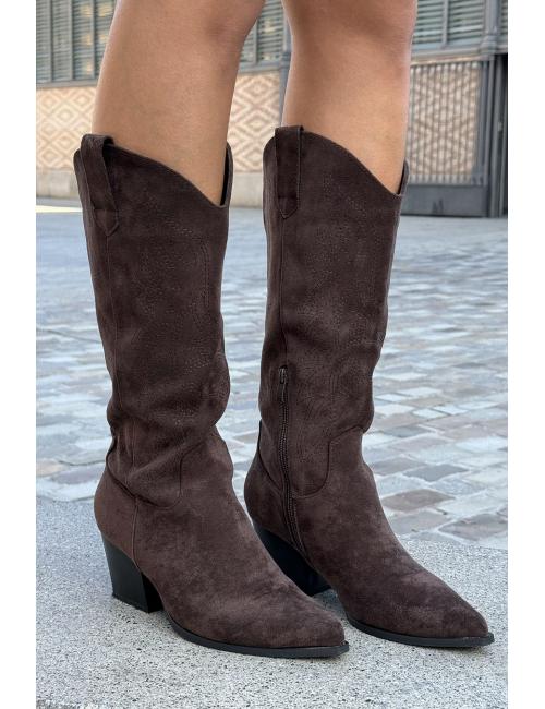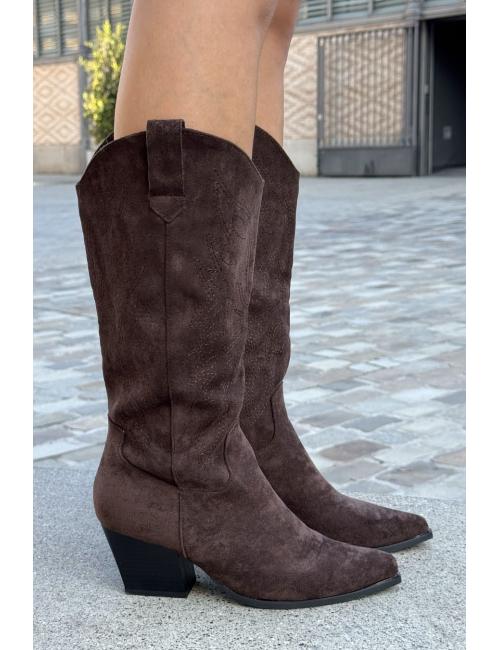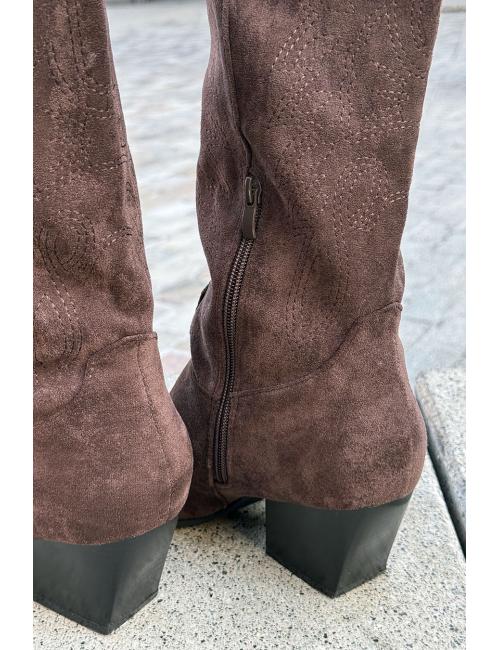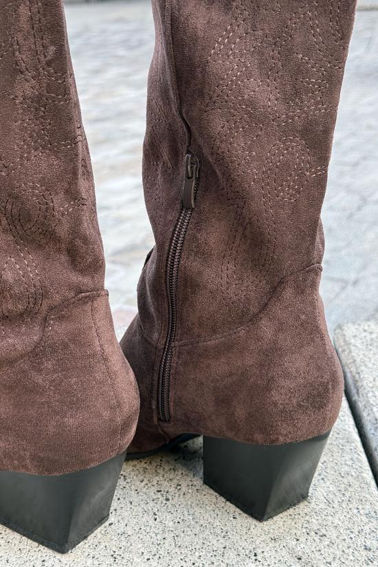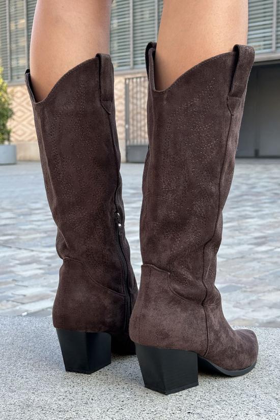 Bota campera de ante con caña media-alta y detalles bordados. Cierre con cremallera en el lateral interior de la bota. Tacón medio de madera y punta fina acabada recta. Diseño actualizado de la clásica bota campera, un calzado versátil y combinable con vestidos, jeans y shorts.