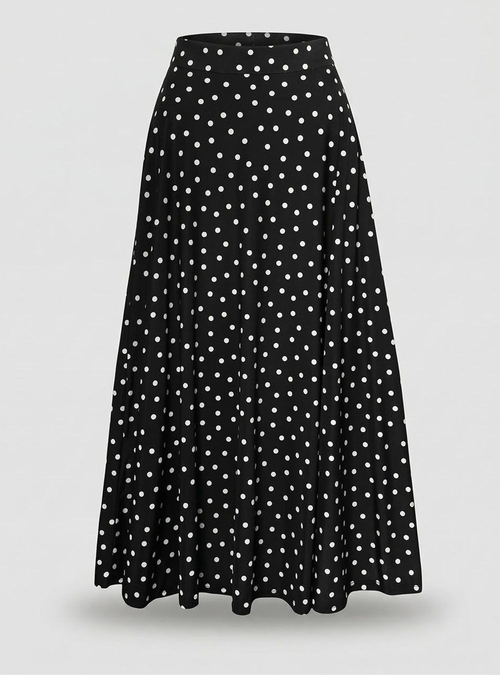 Falda larga fluída y estampada con lunares a contraste. Parte superior más ajustada y vuelo en bajo. Cintura elástica adaptable a varias tallas.