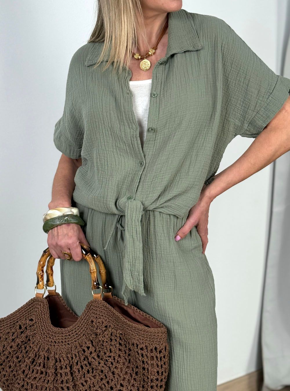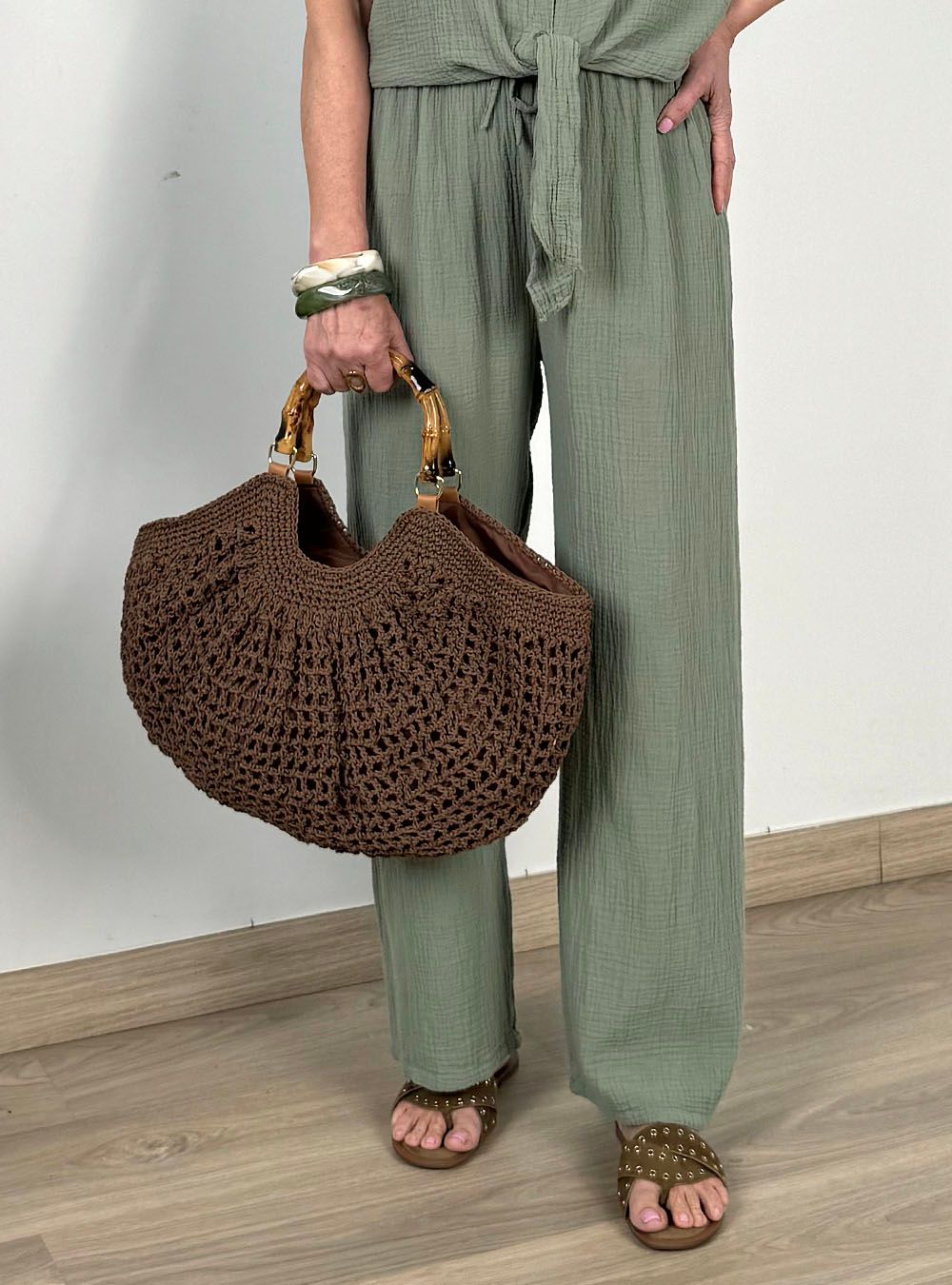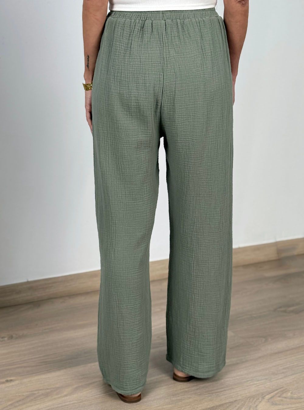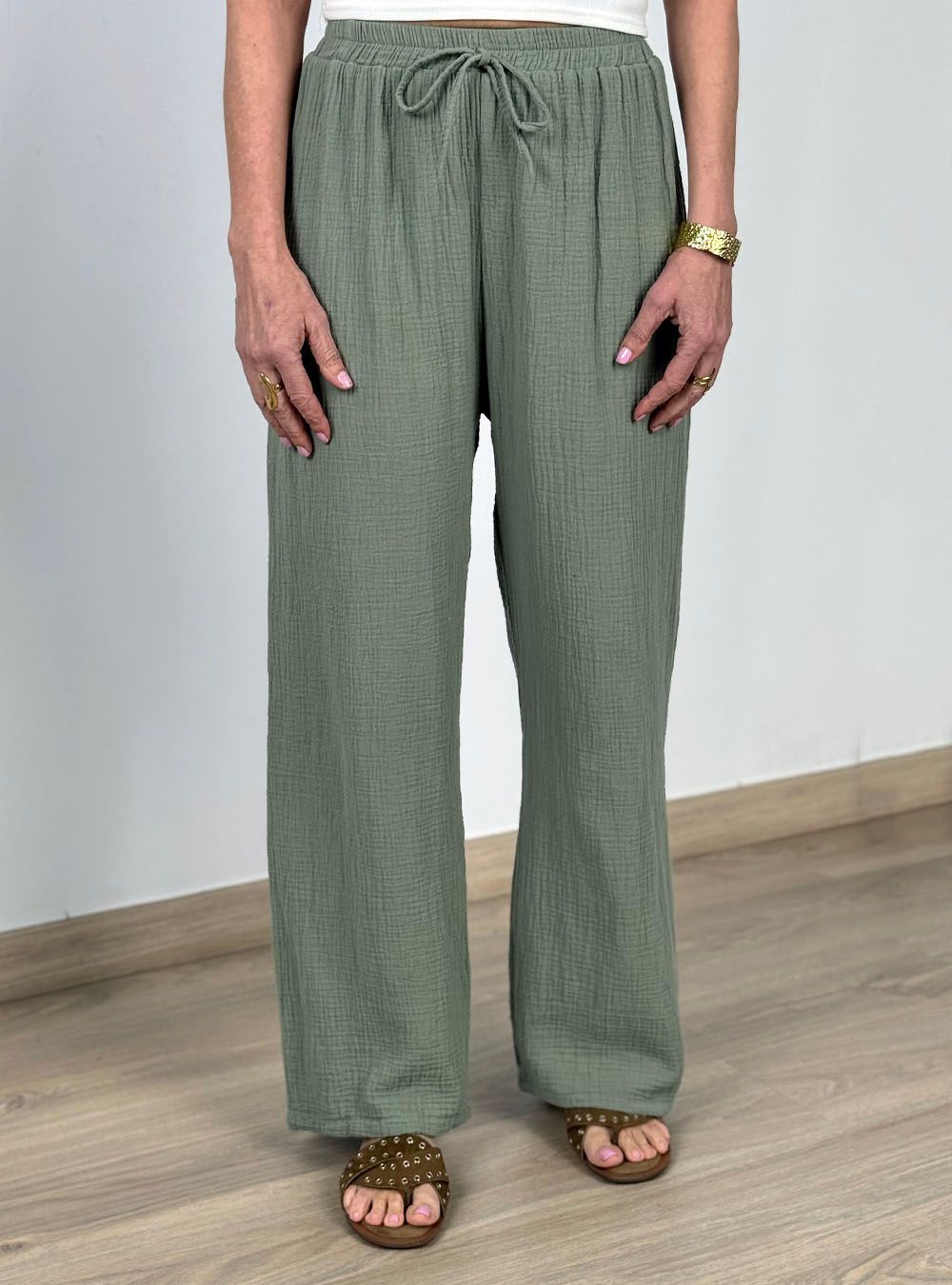 Pantalón de pierna ancha y fluida, confeccionado en tejido bambula, una tela ligera y transpirable, reconocible por su textura arrugada, mezcla de algodón y viscosa. Cintura elástica con dos cordones decorativos. Un pantalón cómodo y versátil, ideal por su frescura, suavidad y caída. No necesita planchado.