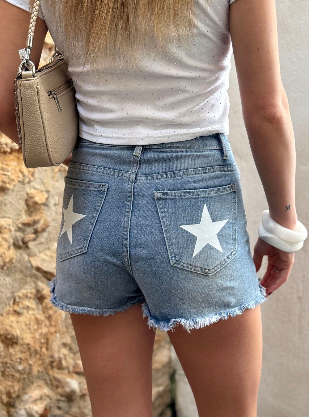 Shorts vaqueros de tiro alto, confeccionados en tejido denim delavado con detalles brillantes, bajo deshilachado y zonas desgastadas con rotos. Detalle de estrellas en bolsillos traseros. Cinco bolsillos y cierre con botón y cremallera.