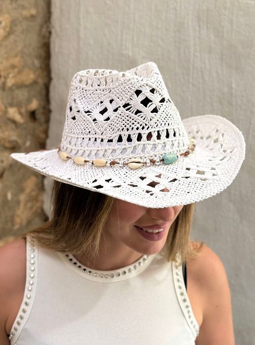 Sombrero de paja sintética tejida de alta calidad con ala ancha y diseño de calados geométricos. Transpirable y ligero. Detalle de cordón trenzado con abalorios de turquesa sintética y conchas marinas.