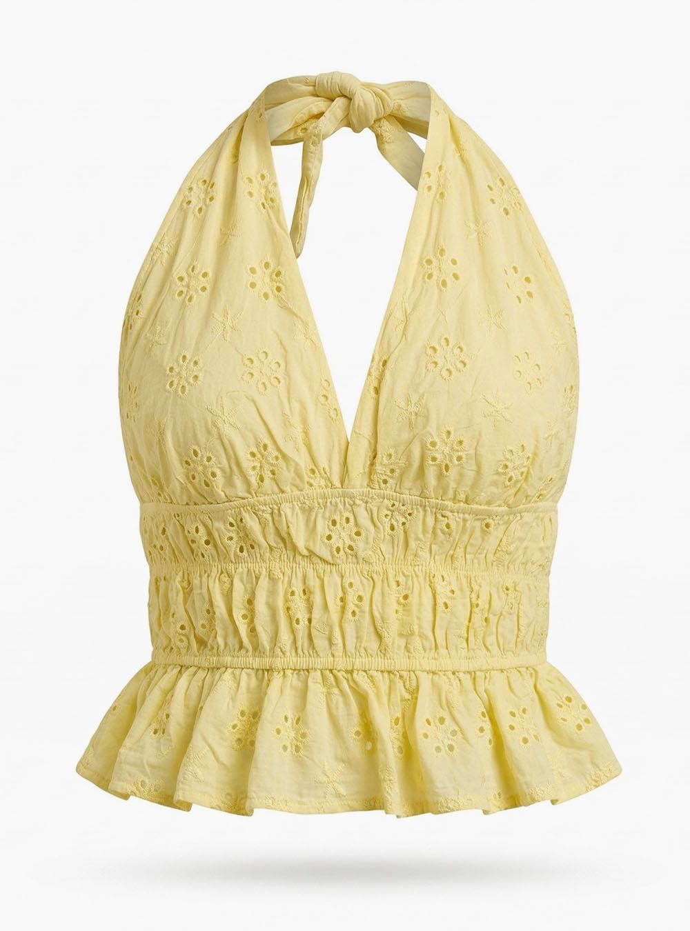 Top atado al cuello y escote en V confeccionado en algodón. Diseño de inspiración babydoll. Se caracteriza por su delicado bordado de ojales (eyelet) y una cintura elástica fruncida con triple goma que crea un volante en la parte inferior. Adaptable a varias tallas.