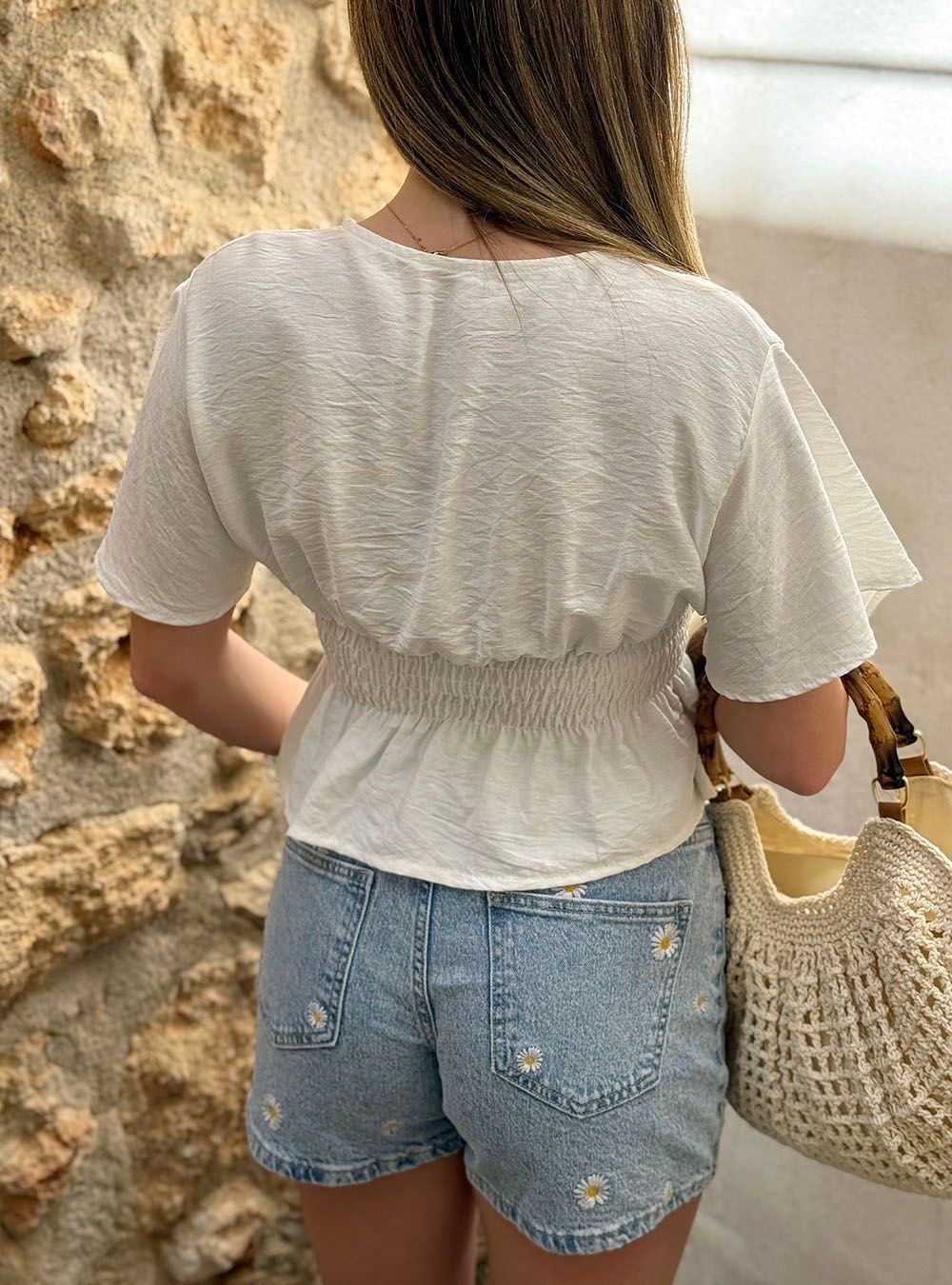 Top de manga corta con vuelo y cintura elástica "nido de abeja". Cuello en V y detalle de bajo con vuelo y cordones para lacito debajo del escote. Top de estilo bohemio ideal para combinar con unos shorts o un pantalón palazzo o de corte relajado.
