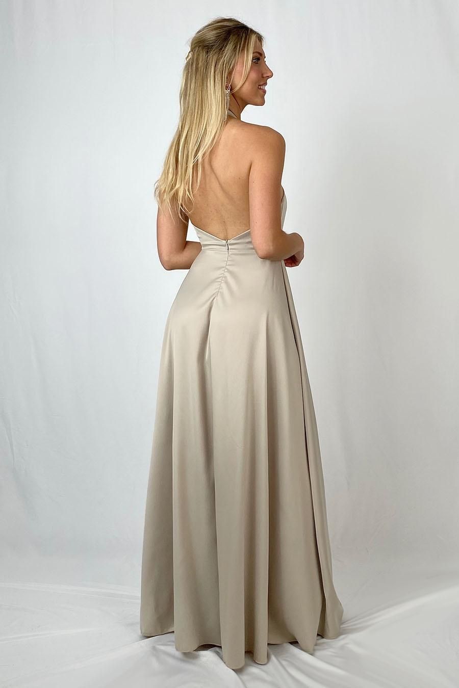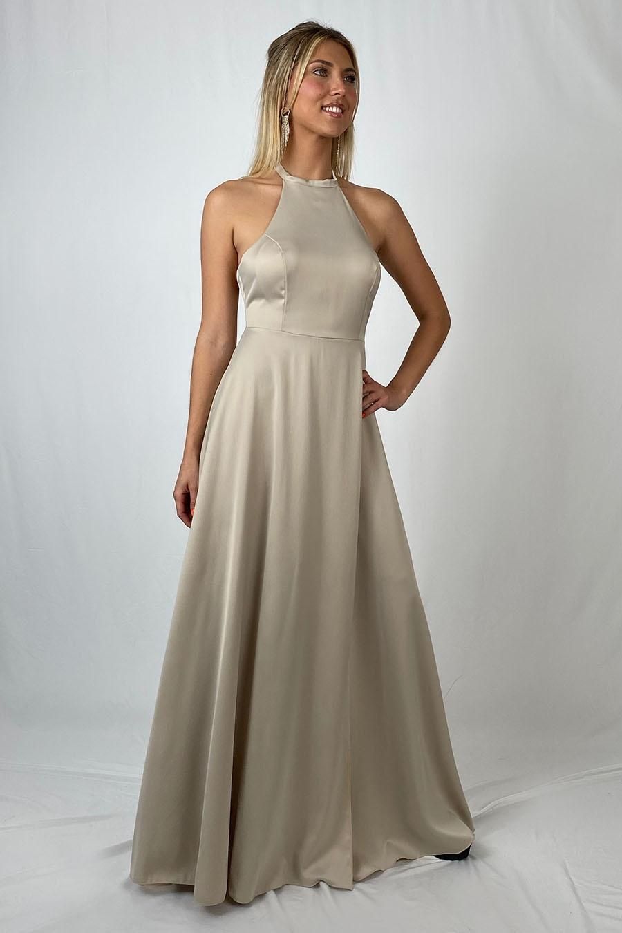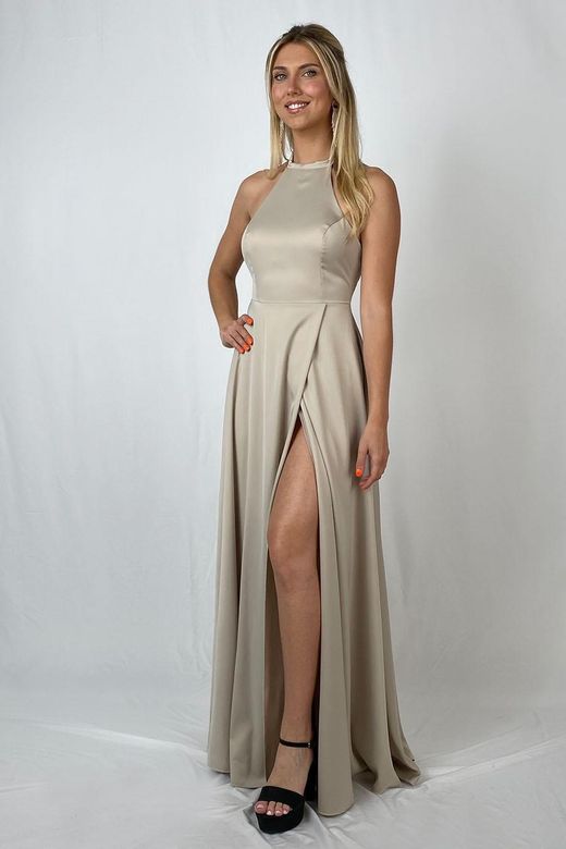 Vestido largo de raso con abertura beige