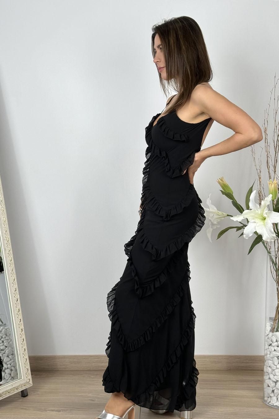 Vestido largo de gasa ceñido con escote en V y volantes. Tiene corte sirena, tirantes finos regulables en altura y un forro que opaca la tranasparencia.TALLA ÚNICA: Compatible con XS, S y MALTURA MODELO: 1,68 MEDIDAS: largo 150 cmCOMPOSICIÓN: 95% Poliéster , 5% Elastano